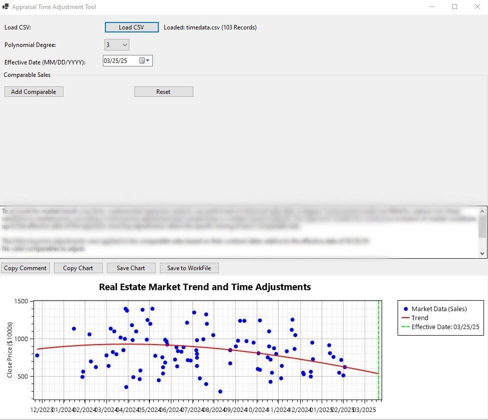 The Appraisal Time Adjustment Tool is a powerful desktop application designed specifically for real estate professionals who need to perform time adjustments in their appraisals. Whether you’re adjusting comparable sales for market trends or analyzing historical data to determine value changes over time, this tool simplifies the process with cutting-edge polynomial regression and interactive charting. Say goodbye to manual calculations and guesswork—this software does the heavy lifting for you, delivering reliable results in just a few clicks.